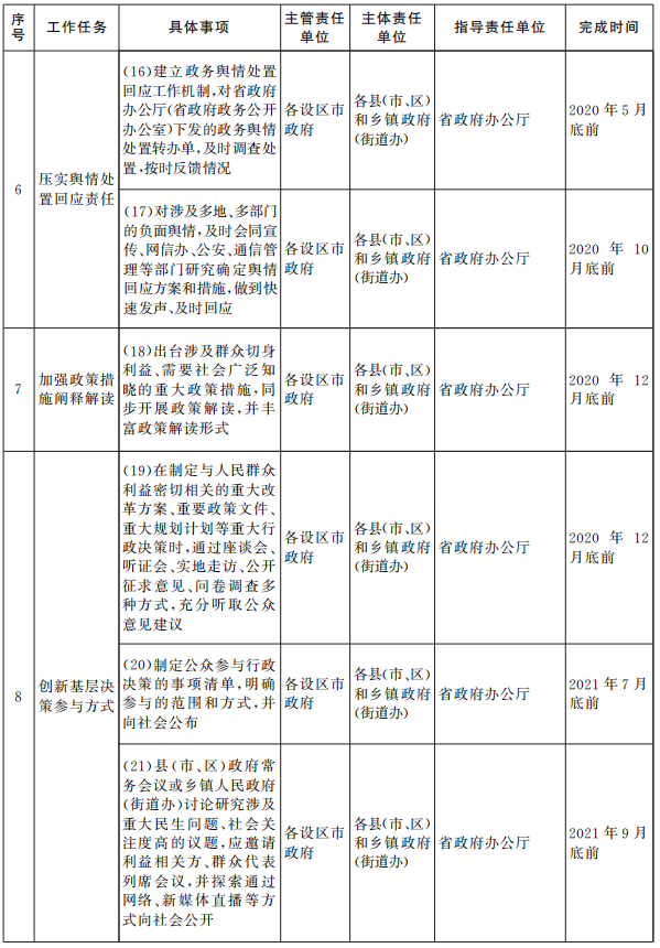 六、规范基层政务公开平台。2020年底前,各设区市政府要全面完成政府网站集约化建设,实现政府网站互联互通、融合发展。县(市、区)政府信息公开平台,应当集中发布主动公开的政府信息,优化信息检索和下载服务功能,整合设置统一的办事服务入口和互动交流入口,便利企业和群众。加强省市县三级政务新媒体矩阵建设,严格政务新媒体信息采集、审核、发布程序,确保运转有序、安全可控。建立网民意见建议审看处置机制,积极借助县级融媒体中心优势和渠道,扩大政府信息传播力和影响力。在政务服务大厅、便民服务中心等场所设立标识清楚、方便实用的政务公开专区,提供政府信息查询、信息公开申请、办事咨询答复等服务。