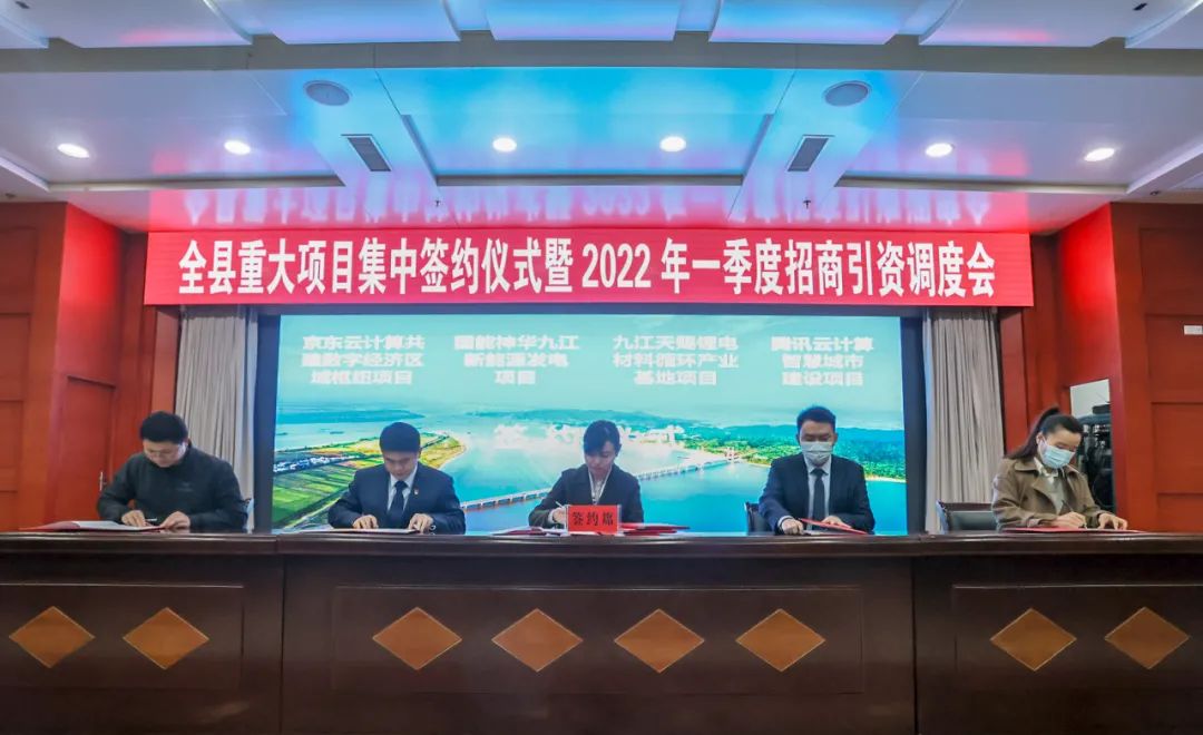 2月16日,湖口县举行重大项目集中签约仪式暨2022年一季度招商引资调度会。会议深入贯彻全省深化发展和改革双“一号工程”推进大会、省市县三级联动推进重大项目开工暨项目大会战动员大会及全市全面推进“三打造”暨项目大会战誓师大会精神,以开局就是决战、起步就是冲刺的状态,以勇担当、重实干、争一流的姿态,务实创新、锐意进取,全力以赴推进招商引资工作,不断开创湖口县经济社会发展新局面。县委书记曾宝柱出席并讲话。县委副书记、县长陈洋主持会议。县委副书记刘奇,县人大常委会主任史文,县政协主席梅媚等县四套班子在家领导出席会议。各招商引资成员单位及签约项目主要负责人参加会议。