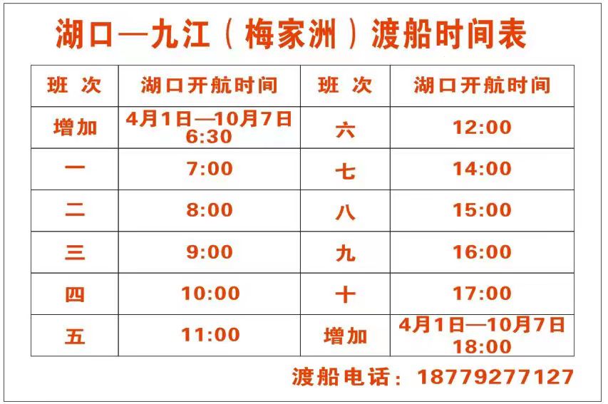 湖口、九江首末班时间为:首班6:00,末班20:00,平峰时段发班间隔15分钟一班次,晚班视客源出行需求确定,节假日高峰时段加密班次。