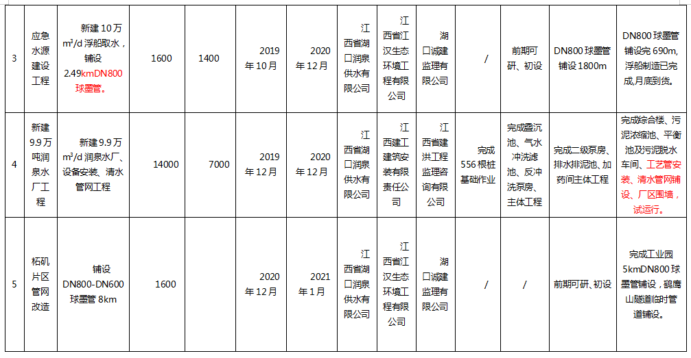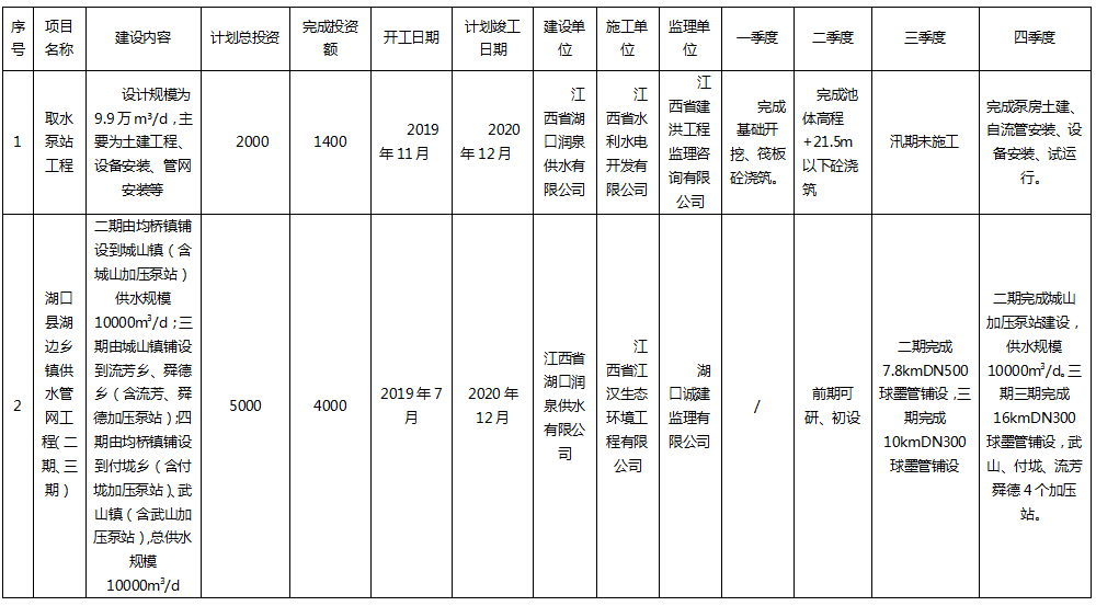 2020年度湖口县城乡一体化供水项目进展信息(四季度)