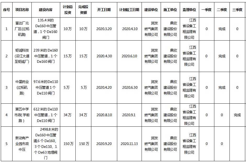 2020年度湖口县润发燃气项目进展信息(三季度)
