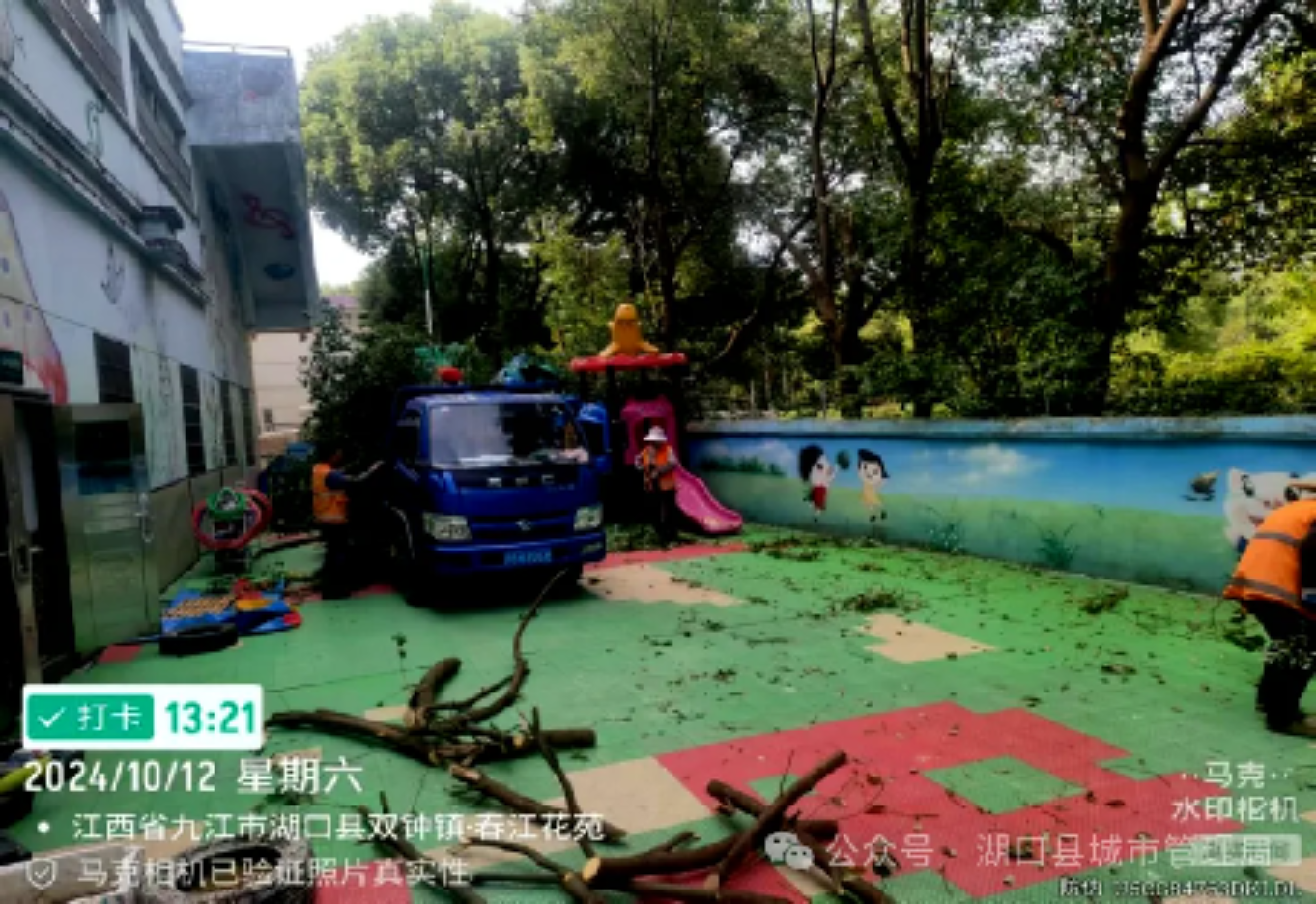 12345市民热线将此问题转派至湖口县城市管理局。城管局园林所工作人员迅速核查,发现树木处于围墙外,在强风、暴雨等极端天气随时可能导致树枝折断,对于幼儿园内的祖国“花朵”构成安全隐患。随后安排工人修剪树木,于10月12日完成了树干部分的修剪工作。经12345热线工作人员回访,诉求人对处理结果表示满意。