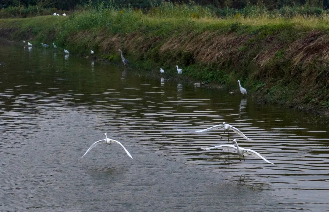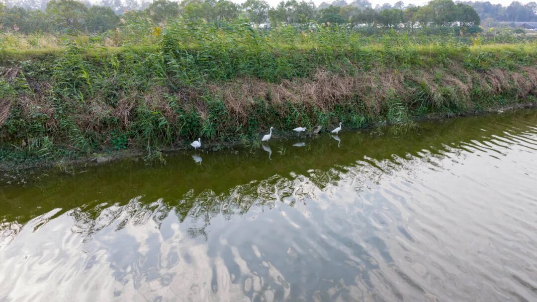 11月7日,时值立冬,位于国家生态乡镇城山镇的团山中心村,成群白鹭时而在池塘轻盈觅食,时而在岸边整齐列队,悠然栖息。