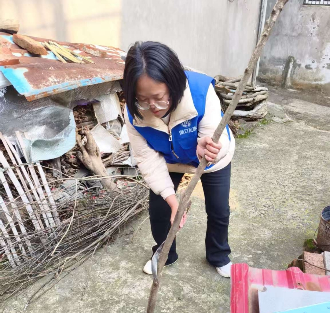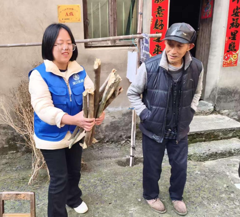 今年71岁的骆大爷是大垅乡民政办重点关注的多重残疾特困老人(听力、言语一级残疾),常年独居。当天,协理员发现老人刚从山上捡拾柴火归来,双手沾满泥土。见此情景,协理员立即挽起衣袖,接过老人手中的柴刀,利落地将木柴劈好,细心在灶台旁码成整齐的柴垛。虽然骆大爷无法用言语交流,但老人一直用手着给协理员倒水,眼神里满是感谢。协理员还查看了老人家中用电安全、食品安全等情况。