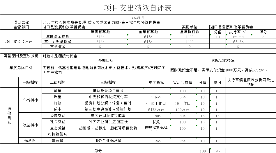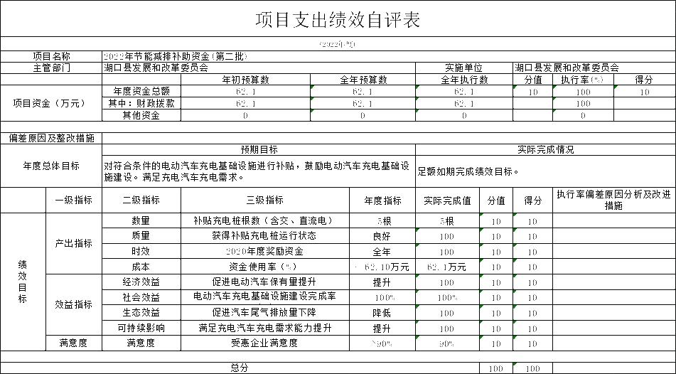 通过对全年部门预决算情况和部门履职工作成效情况认真统计和分析,我们对2022年度湖口县发改委部门整体支出绩效进行客观综合评价,评价得分为98分,评价档次为“优”。