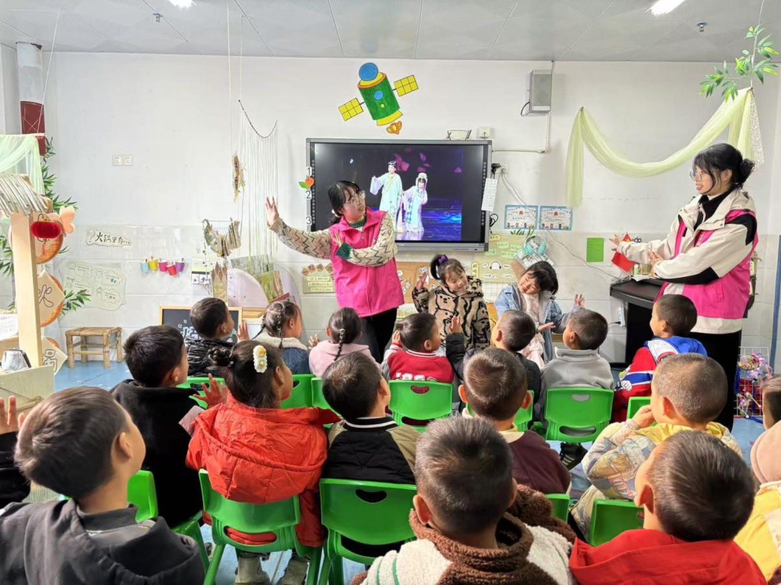 活动中,爱心妈妈们首先为孩子们介绍了青阳腔的历史渊源、艺术特点以及它在戏曲文化中的重要地位。随后,孩子们观看了《金锁记》青阳腔戏曲视频,在爱心妈妈的指导下尝试绘制青阳腔头饰或服饰,让孩子们在动手实践中感受传统文化的魅力。