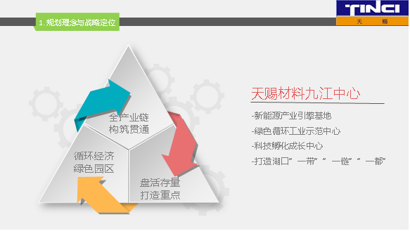 天赐新材料循环产业园目前规划1032平方米,远期规划3000亩,依托现有九江天赐高新材料有限公司、九江天祺氟硅材料有限公司(下文简称九江天祺)、九江容汇锂业科技有限公司(下文简称九江容汇)等企业龙头,引进世界一流的化工生产工艺,建设一个以含锂新材料、个人护理产品为基础,精细化工为特色的新材料循环产业园区。园区技术创新由江西天赐新材料创新中心有限公司提供支持,此外,统一协调园区安全环保系统,主要包括综合污水处理系统、废液焚烧系统、消防应急救援系统等。园区规划重点发展技术密集、资金密集的精细化工、化工新材料等产业,遵循“集中、统一、共享、提高”的原则,对园区内各企业(装置)产业资源进行全面整合,实现安全统一管理,环保统一治理。建设上体现“产品项目、公用工程设施、物流传输、环境保护、管理服务”五位一体的思想。通过园区企业资源的综合利用,提高企业盈利能力,形成良好的可持续发展态势。