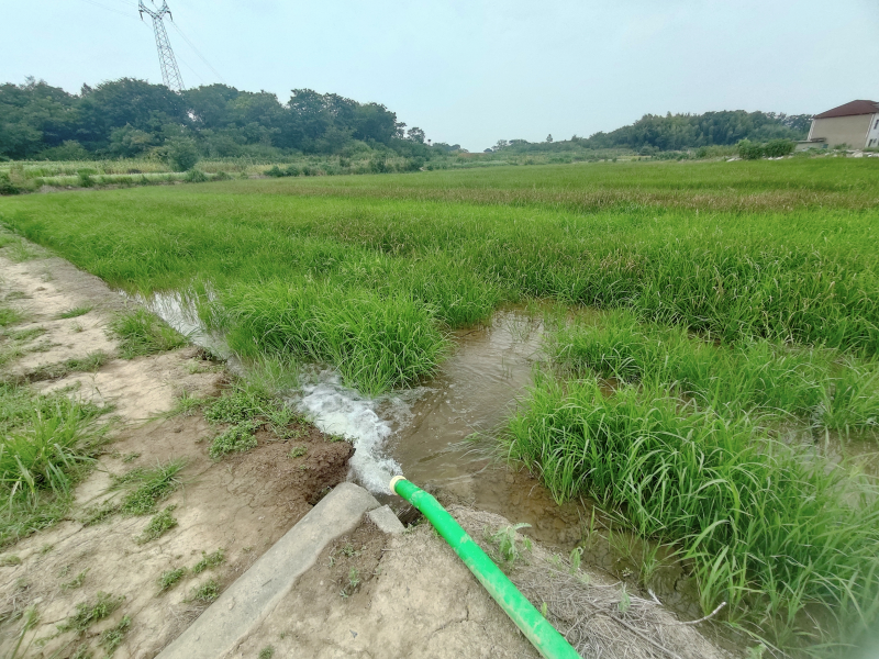 在文桥村种植大户肖毛科的承包田边,旱情尤为严峻,连日的晴热高温导致数百亩正处于需水关键期的水稻田面临“口渴”威胁,部分田块已出现土地龟裂、禾苗卷叶的现象。旱情就是命令,文桥村迅速开展引水灌溉工作,搬运设备、铺设水管、安装调试水泵,经过数小时的努力,渠水通过新架设的管道,源源不断地涌入干渴的稻田。