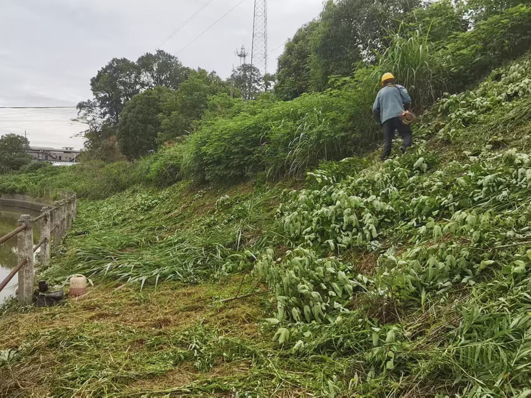 为高效解决问题,乡镇提前一周实地勘察,结合护坡实际制定 “分片负责、专业协同” 方案:镇水利站负责技术指导,处理顽固杂草;志愿者分组割除地表杂草;社区、村干部协调场地、引导群众避开作业区,形成分工明确的工作格局。