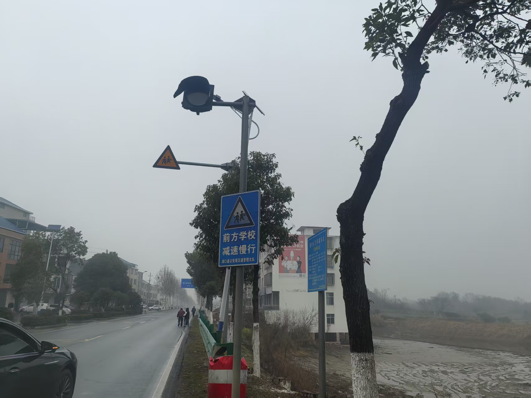 整治过程中,工作人员逐校踏勘、逐段排查,重点聚焦临水路段、学生上下学高峰通行路段、路口交汇点等关键区域,精准施策、靶向治理。按照规范标准,合理增设交通警示标志、限速标识、注意儿童提示牌,重新施划人行横道、减速标线、禁停网格线,在危险路段安装防护栏、防撞墩、反光警示桩等防护设施,做到标志清晰、标线规范、防护到位。通过硬件升级与秩序优化,进一步健全校园周边交通安全防范体系,从源头降低通行风险。