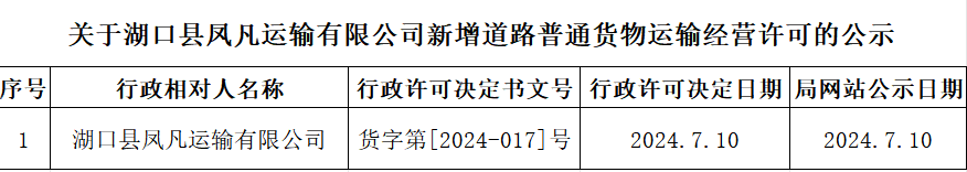 关于湖口县凤凡运输有限公司新增道路普通货物运输经营许可的公示