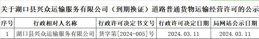 关于湖口县兴众运输服务有限公司(到期换证)道路普通货物运输经营许可的公示