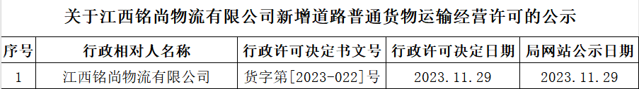 关于江西铭尚物流有限公司新增道路普通货物运输经营许可的公示