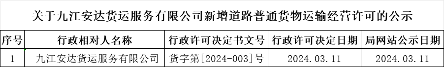 关于九江安达货运服务有限公司新增道路普通货物运输经营许可的公示
