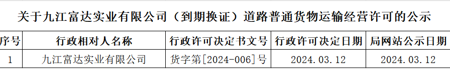 关于九江富达实业有限公司(到期换证)道路普通货物运输经营许可的公示