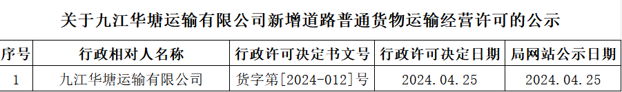 关于九江华塘运输有限公司新增道路普通货物运输经营许可的公示