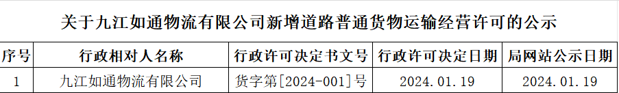 关于九江如通物流有限公司新增道路普通货物运输经营许可的公示