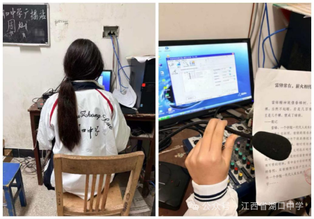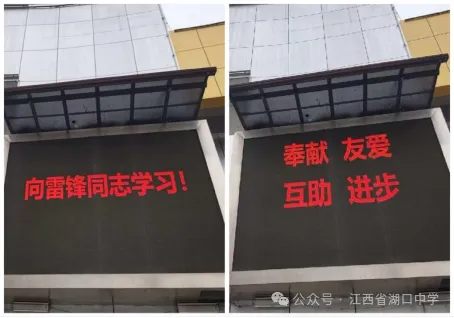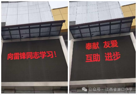在校园主干道悬挂“弘扬雷锋精神,争做时代新人”等宣传横幅。利用校园广播播发学雷锋相关歌曲、文章和学生征文投稿。在校园门口电子屏滚动播出“奉献、友爱、互助、进步”等字幕。