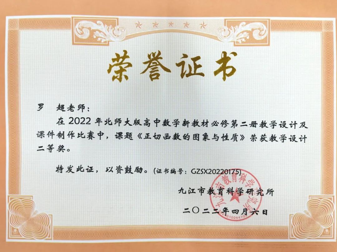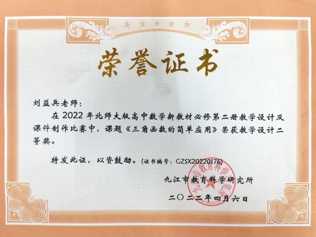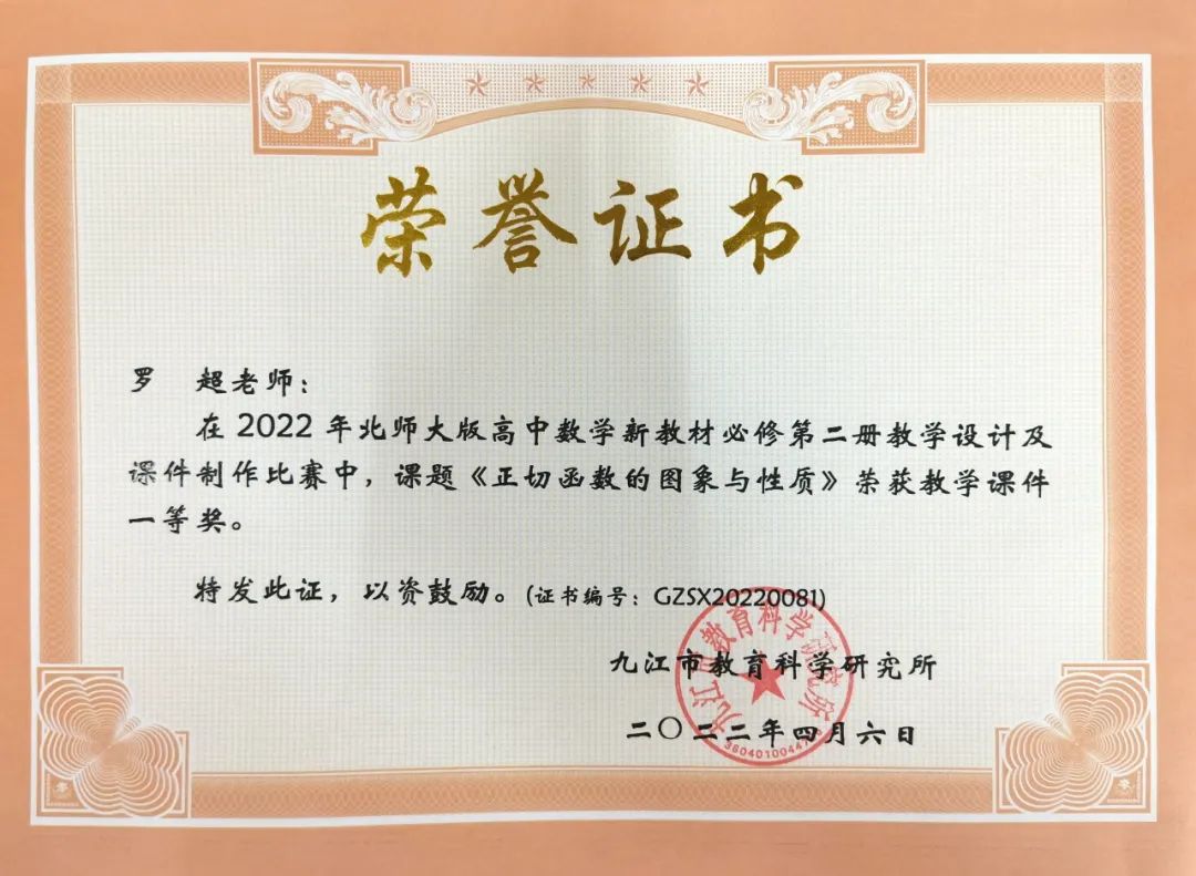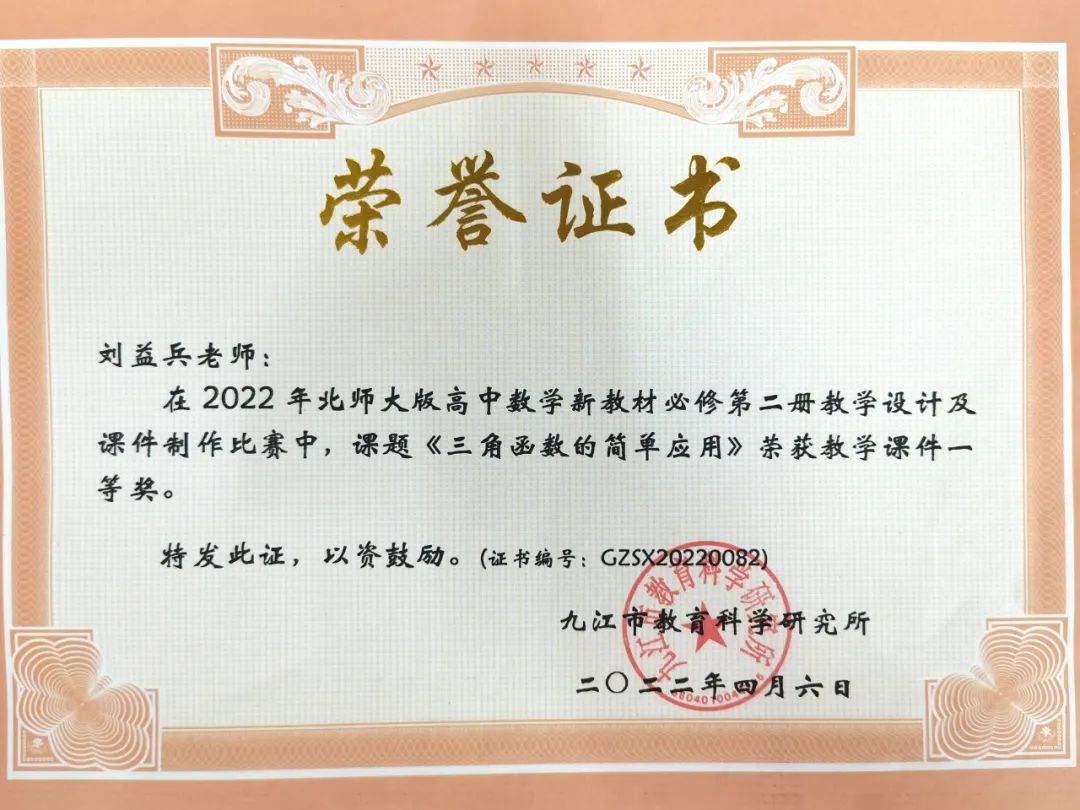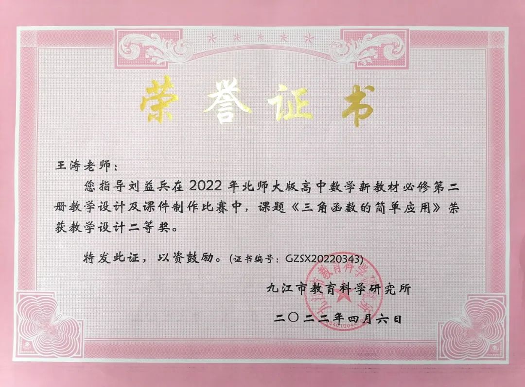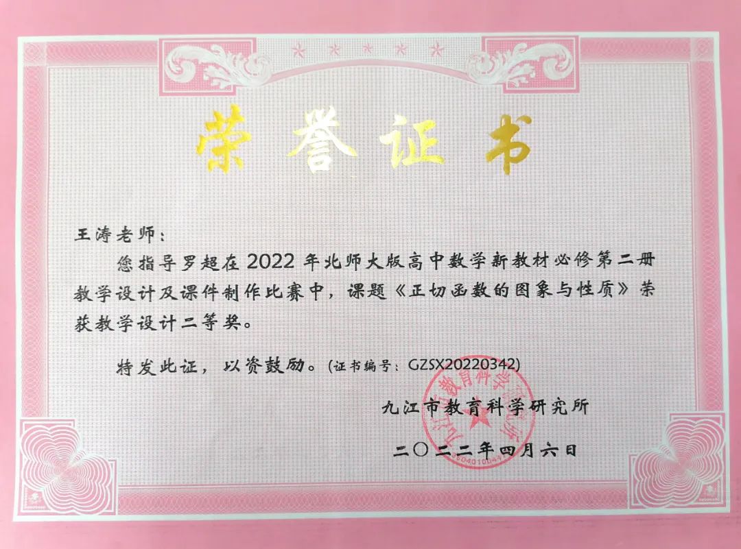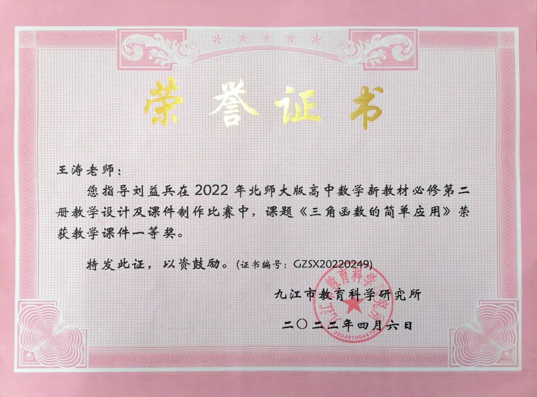 其中,湖口县第二届名师、工作室主持人王涛指导的工作室成员刘益兵的课题《三角函数的简单应用》荣获课件一等奖、教学设计二等奖,指导成员罗超的课题《正切函数的图像与性质》获得课件一等奖、教学设计二等奖。