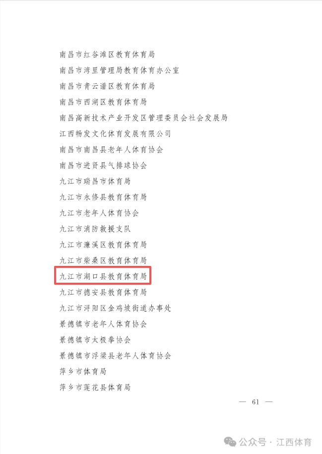 2021—2024年度全国群众体育先进单位、先进个人和全国体育系统先进集体、先进个人表彰大会11月10日在广州举行,湖口县教育体育局获评全国群众体育先进单位。