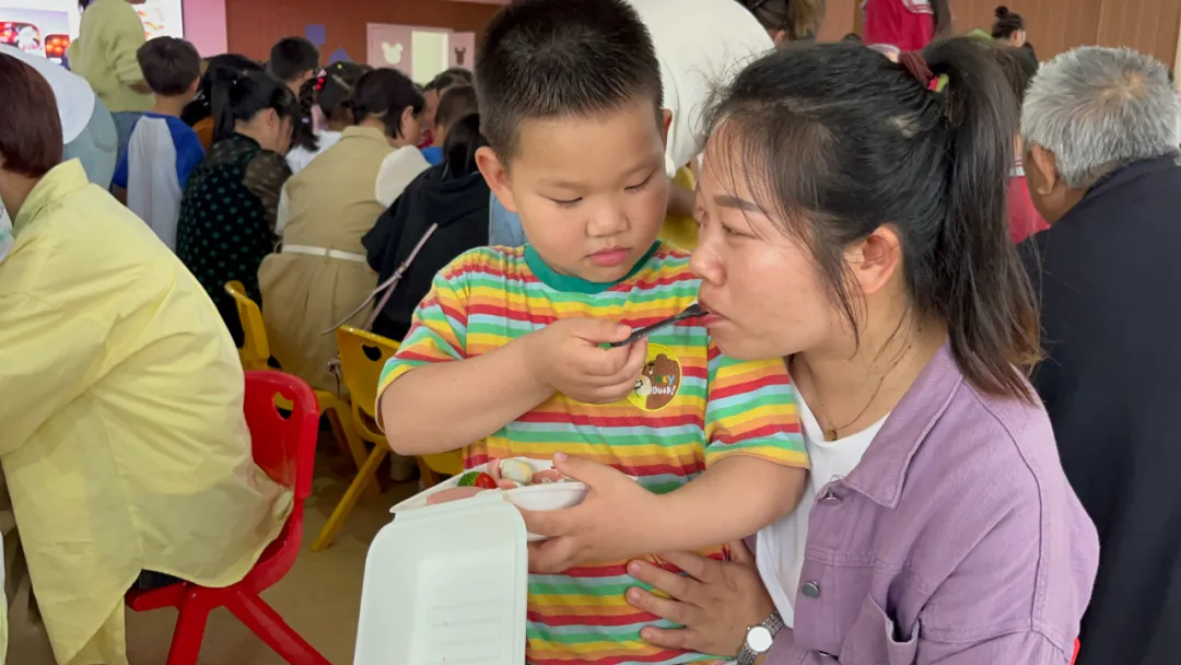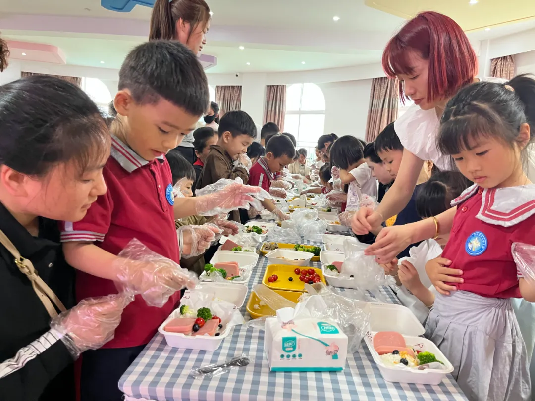除了“孕肚”体验,孩子们还邀请妈妈共同制作爱心便当。在妈妈的陪伴下他们认真地切菜、搅拌、摆盘,每一个步骤都洋溢着童真与乐趣。妈妈们则在一旁耐心地指导,不时给予鼓励和赞美,让孩子们感受到了母爱的温暖和力量。