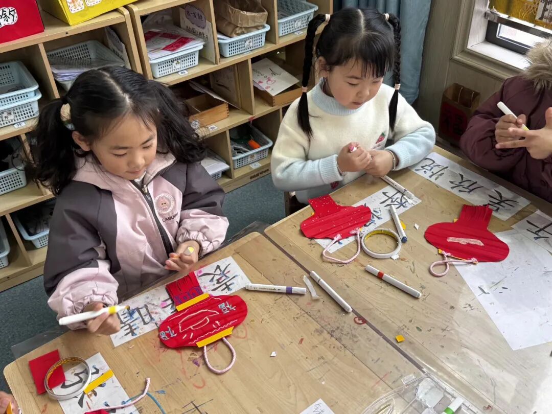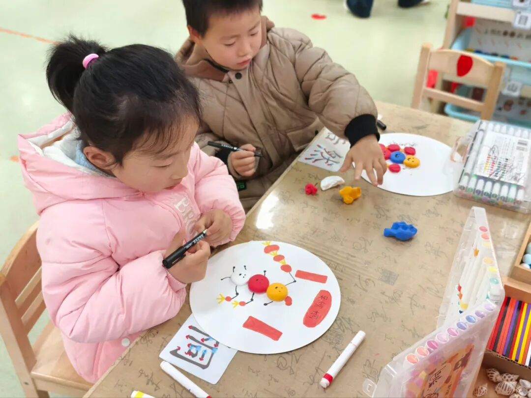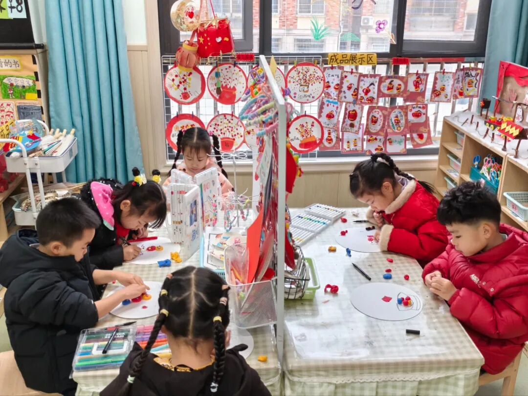 接着,大班孩子们化身“小小艺术家”,用彩纸、黏土、竹签等环保材料制作灯笼,中班的宝贝们通过搓一搓、揉一揉用五颜六色的黏土开启了一场“汤圆制作大赛”。小班幼儿则在老师的协助下,用彩笔在灯笼上画下笑脸、星星等图案,每一盏灯笼都承载着童真与创意。孩子们提着作品合影留念,红彤彤的灯笼与孩子们的笑脸交相辉映,成为园区最亮丽的风景。