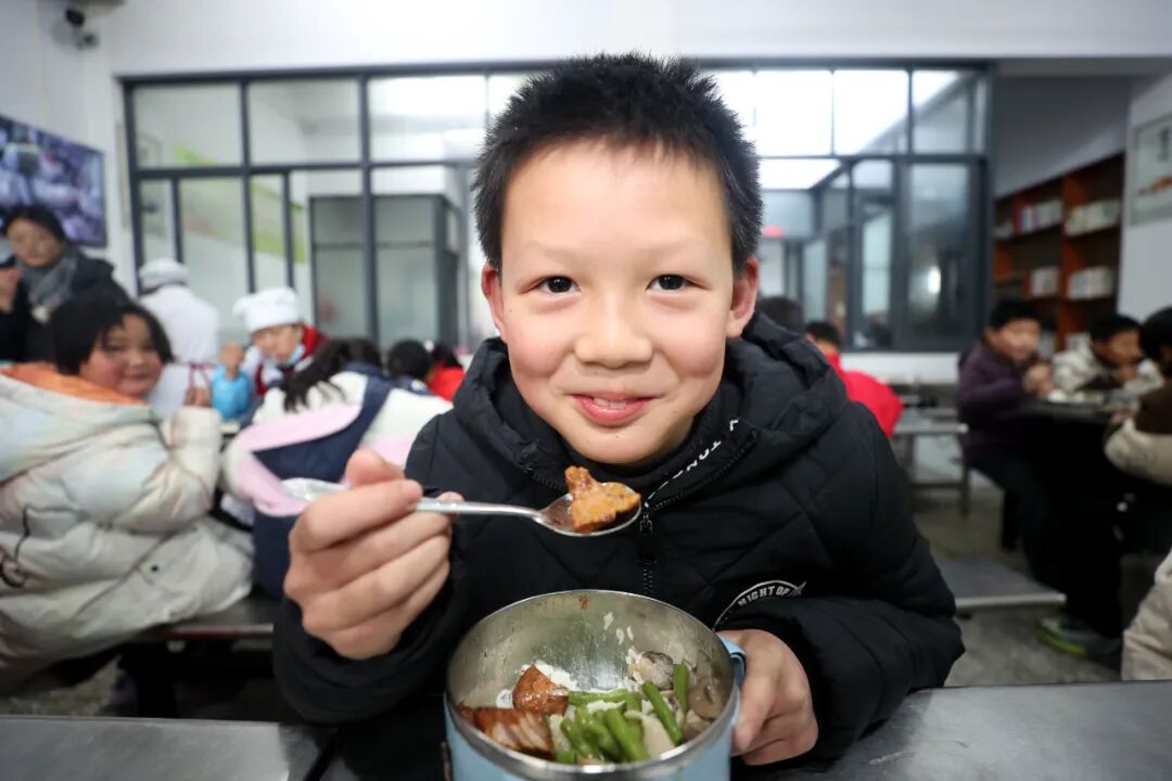 “我从一年级开始就在这里上学,现在已经六年级了,这期间吃得全是免费营养午餐,我觉得食堂饭菜香甜可口,而且荤素搭配,非常健康。最喜欢的菜是红烧牛肉,真的非常好吃,一个星期能吃两三次呢。”六年级学生朱子晴开心地说。