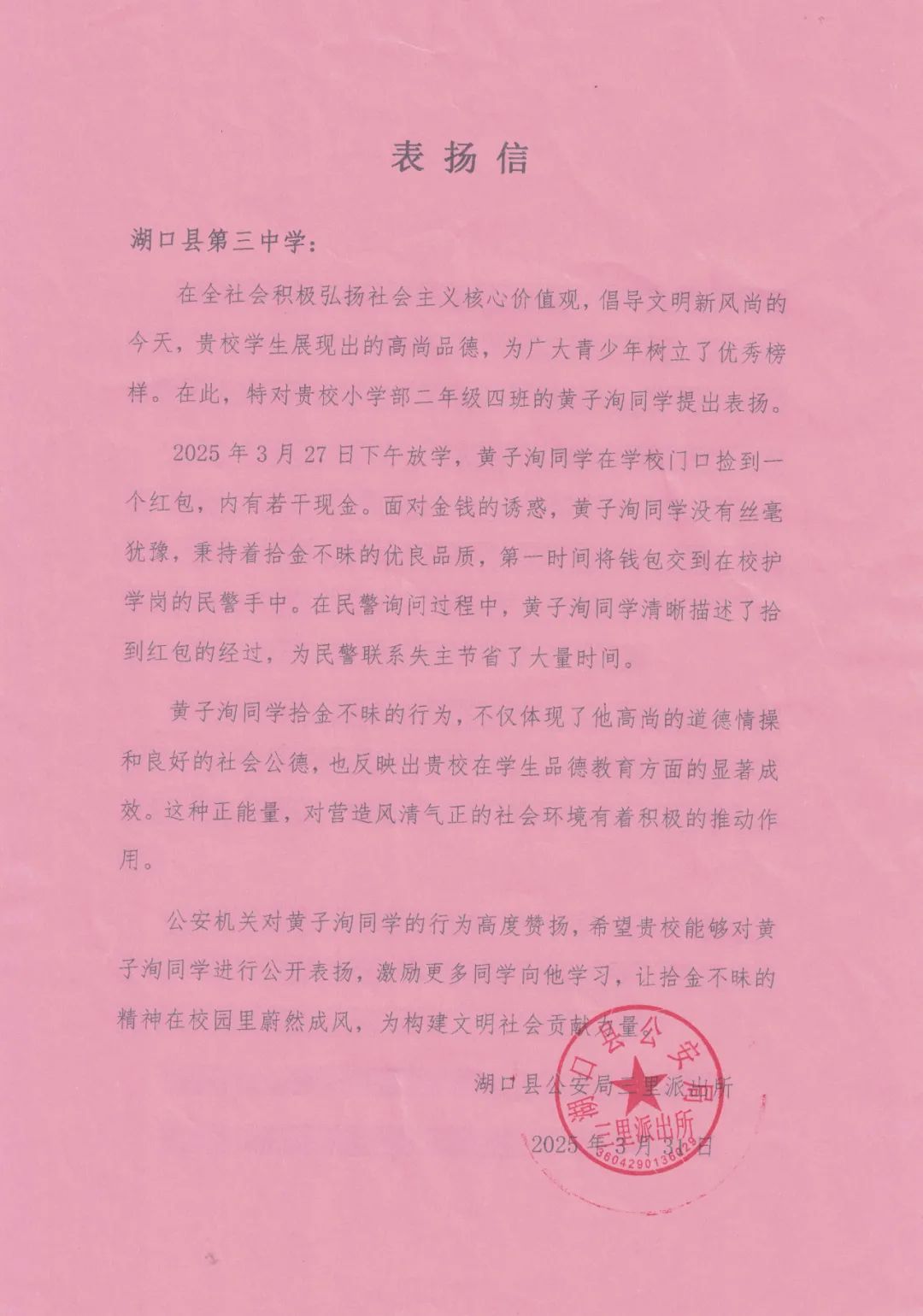 在4月1日举行的表彰仪式上,派出所民警为少先队员黄子洵颁发“拾金不昧好队员”表扬信和礼品,称赞其行为“彰显诚信力量,树立社会榜样”。全校师生共同见证,并以热烈的掌声表达赞美之情。