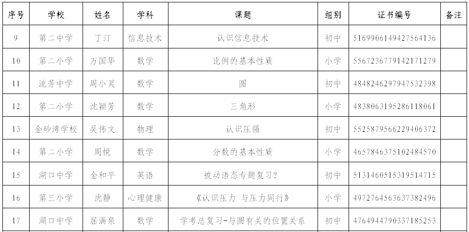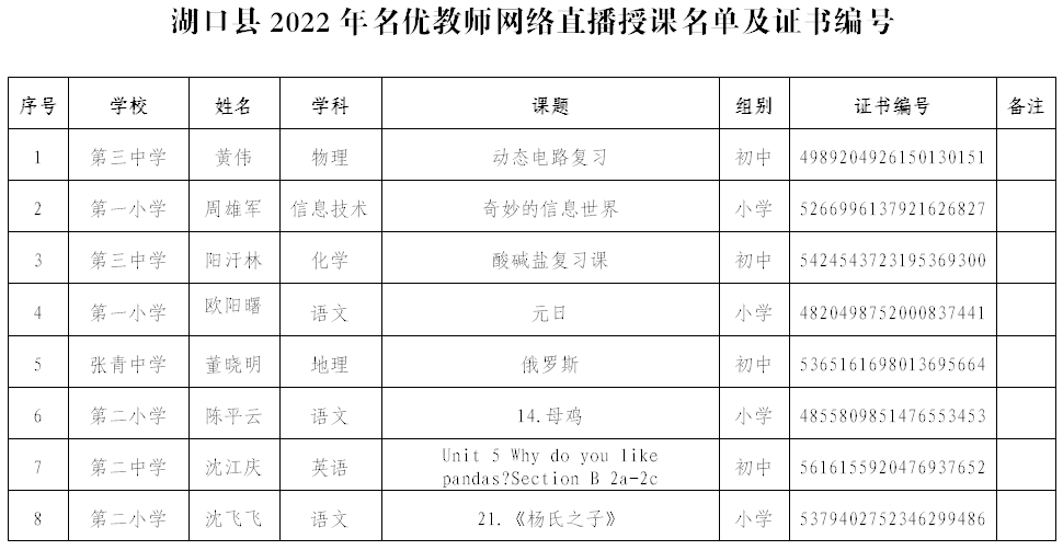 附件:湖口县2022年名优教师网络直播授课名单及证书编号