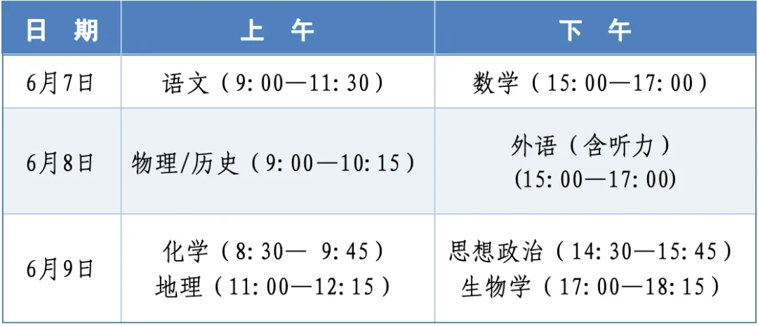 7.我省2026年普通高考文化科目继续实行“3+1+2”模式,“3”为全国统考科目,即语文、数学、外语(含英语、俄语、日语、法语、德语、西班牙语),由教育部统一命题。“1”为首选科目,即物理、历史中的1科;“2”为再选科目,即思想政治、地理、化学、生物学4科中的2科,首选和再选科目由我省自主命题。考生高考文化总成绩由全国统考科目成绩和选考科目成绩组成,满分750分。其中,语文、数学、外语三门统考科目每科满分150分,直接以卷面原始分数计入高考文化总成绩;考生选择的三门选考科目每科满分100分,首选科目(物理、历史2选1)直接以卷面原始分数计入高考文化总成绩,再选科目(思想政治、地理、化学、生物学4选2)依据相关规定,以转换后的分数计入高考文化总成绩。考试时间为6月7日—9日,各科目考试时间为: