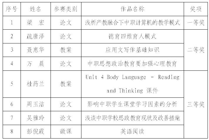 近日,2022年全国中教杯教师教学技能大赛获奖名单公布,湖口县中等职业技术学校教师在本次比赛中取得一个一等奖、三个二等奖和四个三等奖的成绩。