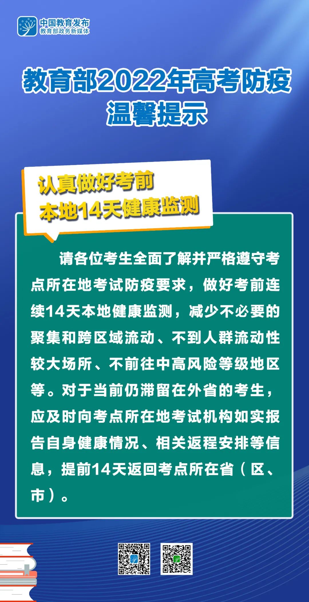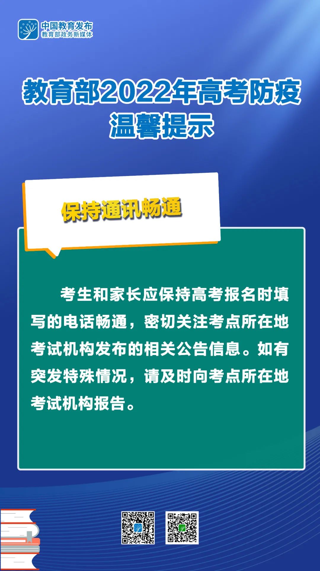 为切实保障广大考生和考试工作人员的生命安全和身体健康,确保2022年全国高考平稳、有序举行,按照教育部、国家卫生健康委关于高考防疫工作的有关要求,近期,各地已陆续向2022年高考考生发布参加高考的注意事项。在此,教育部再次提醒全体考生——
