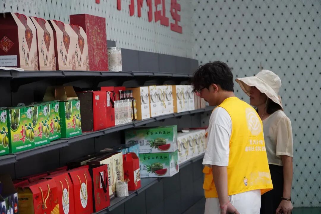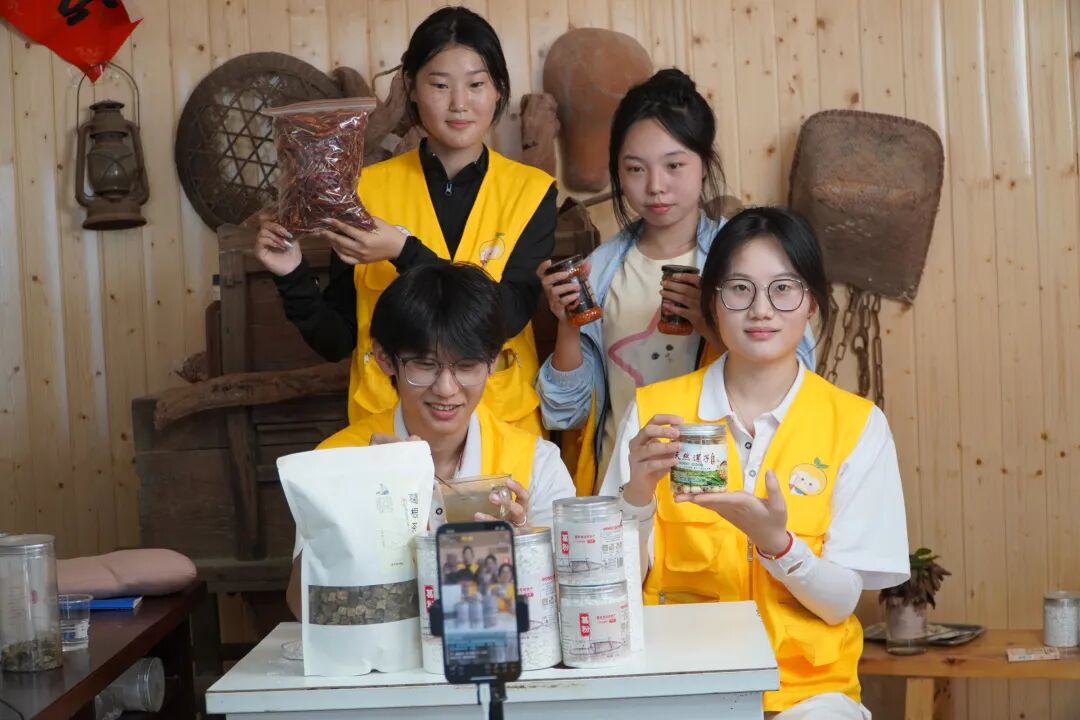 随后,大家来到数字电商产业基地。基地的货架上,陈列着葛根粉、干辣椒、莲子等当地特色农产品。在专业人员的指导下,九江职大的学子们为农户开展直播技能培训,协助设计直播方案,共同参与农产品直播带货,提升农户的线上销售能力。