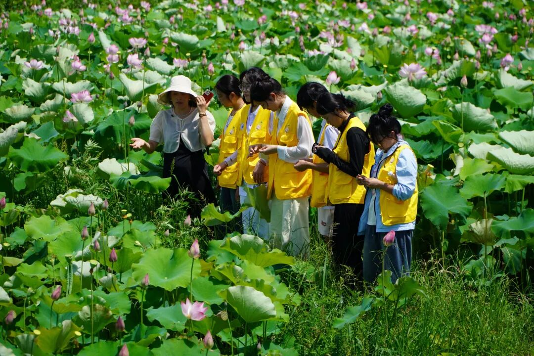 离开菊花种植大棚,实践队师生在流泗镇新时代文明实践所的组织下,与村委会负责人一同前往村中的荷花池,聚焦本地特色莲子产业。