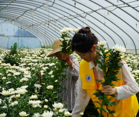 活动首站来到红星村菊花种植大棚,一场别开生面的产业课堂在此开讲。大棚负责人详细地向大学生们介绍菊花品种特性、播种育苗技术等专业知识。青年志愿者们认真聆听,不时向田间劳作的花农请教辨别和采摘成熟菊花的技巧,并亲身体验采摘过程,体会农业生产的艰辛。这堂“田间课堂”有效促进了知识与实践的融合,为志愿者们上了生动的一课。