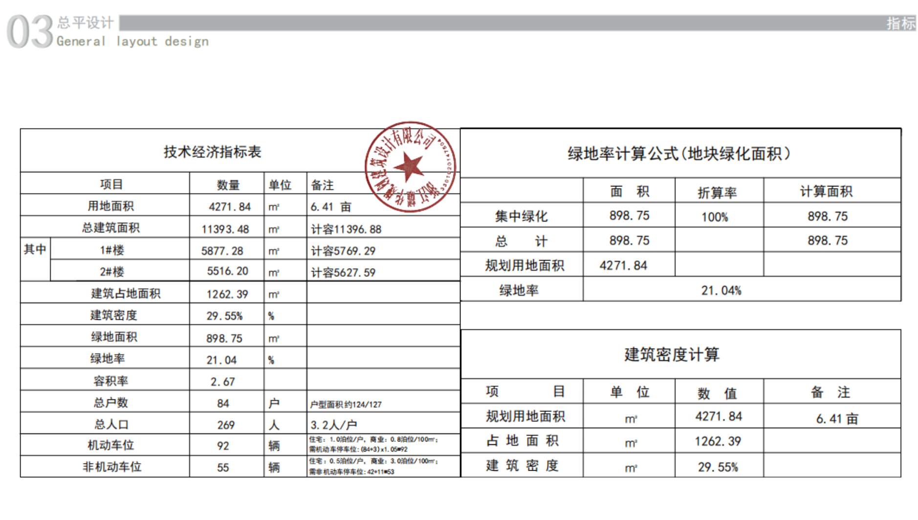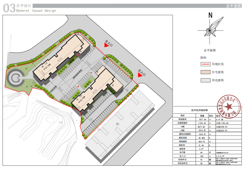 具体内容:湖口县2024年度安置房建设项目-湖口县流泗镇瑞龙苑安置房建设项目总用地面积4271.84㎡,用地性质为出让,容积率为2.67,建筑密度为29.55% ,绿地率为21.04%。该项目总建筑面积为11393.48㎡,总计容面积为11396.88㎡。其中一号楼建筑面积为5877.28㎡,计容面积为5769.29㎡,不计容面积为232.88㎡,二号楼建筑面积为5516.20㎡,计容面积为5627.59㎡,不计容面积为0㎡。