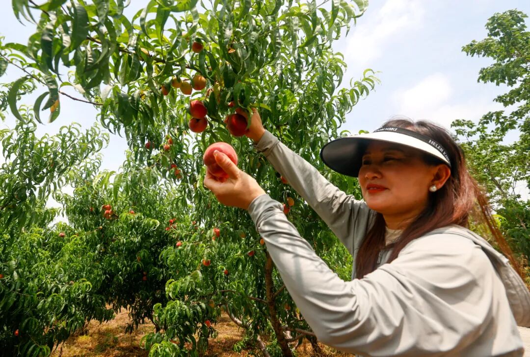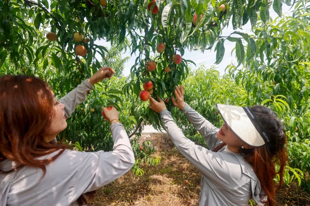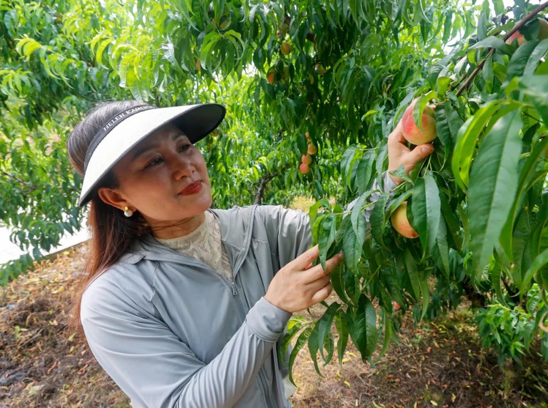 “去年的时候,我妻子说这里的桃子特别大特别甜,我当时没吃几个觉得可惜,今年就专门过来了。这些桃子确实不错,又甜又脆,我本身也很喜欢桃子。”游客闻强高兴地说。