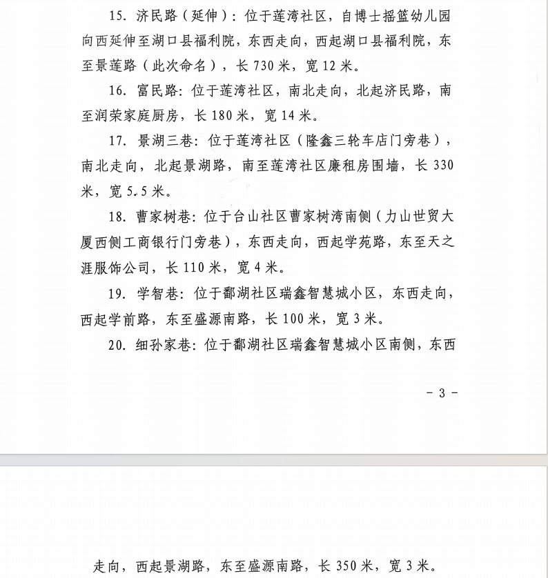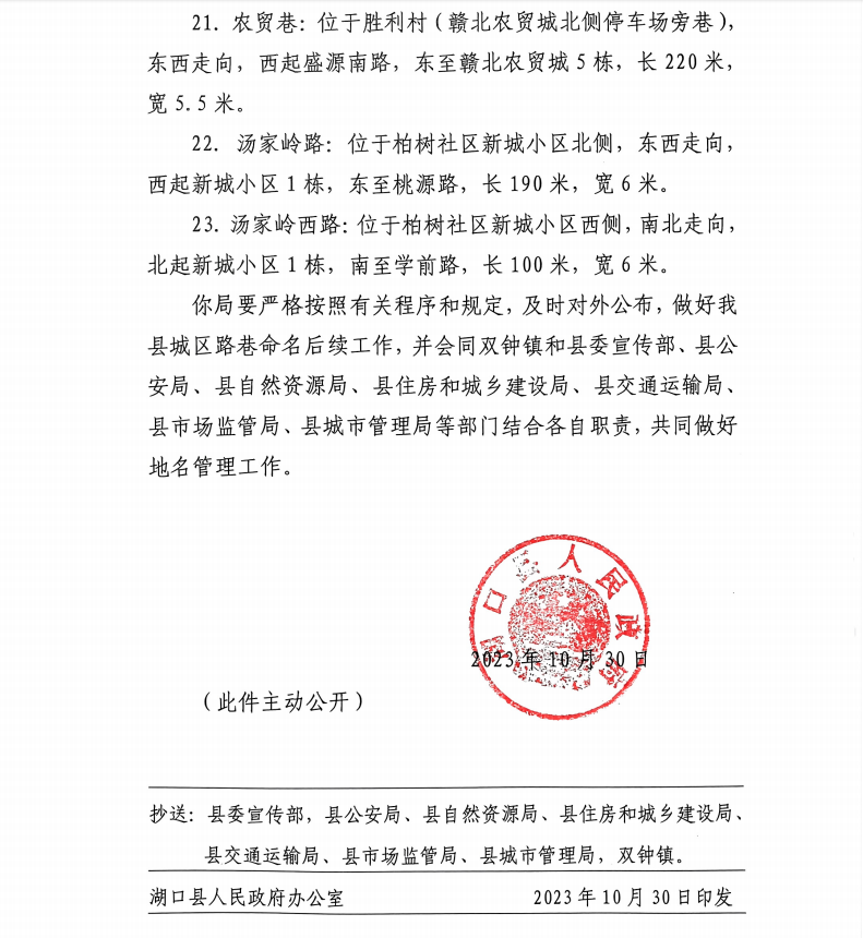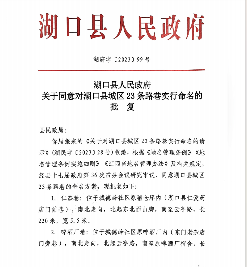 湖口县人民政府关于同意对湖口县城区23条路巷实行命名的批复 湖府字〔2023〕99号