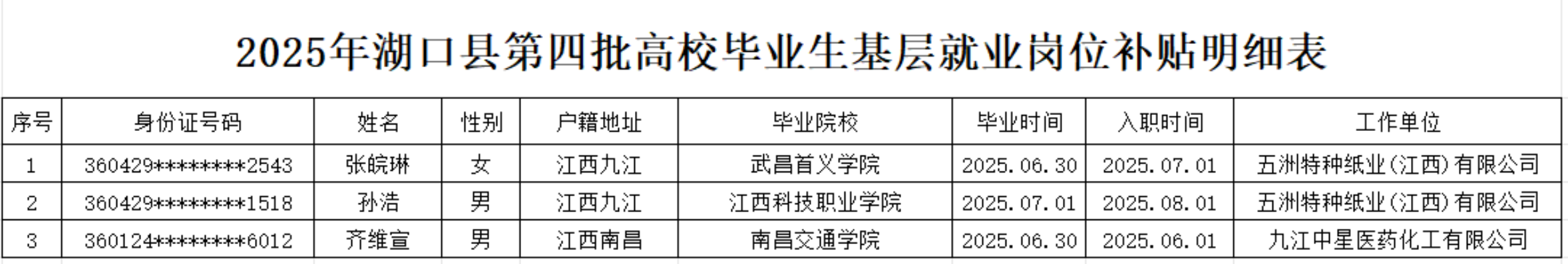 根据《江西省人力资源和社会保障厅 江西省工业和信息化厅 江西省财政厅关于做好高校毕业生基层就业岗位补贴工作的通知》(赣人社〔2025〕108号)文件精神,经本人申请,我中心审核,拟对以下3名2025年入职我县专精特新中小企业就业岗位的高校毕业生(毕业2年内未就业的江西户籍或江西省高校毕业的高校毕业生)落实高校毕业生基层就业岗位补贴,现将人员名单公示如下: