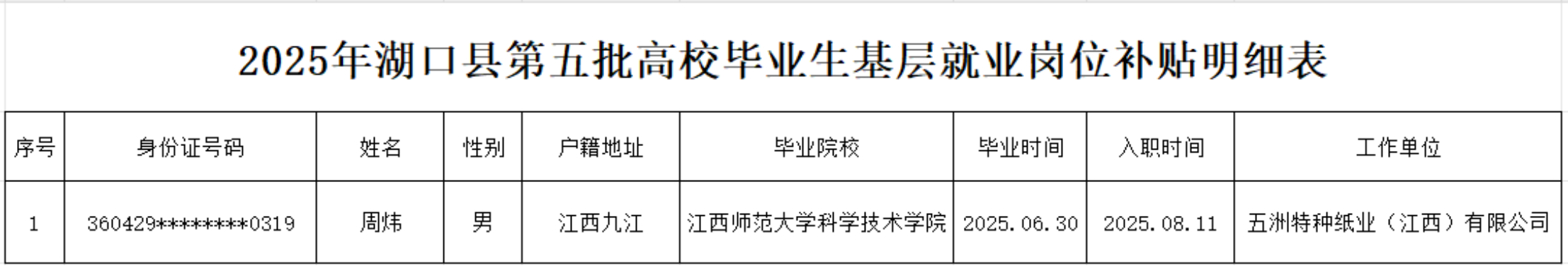 根据《江西省人力资源和社会保障厅 江西省工业和信息化厅 江西省财政厅关于做好高校毕业生基层就业岗位补贴工作的通知》(赣人社〔2025〕108号)文件精神,经本人申请,我中心审核,拟对以下1名2025年入职我县专精特新中小企业就业岗位的高校毕业生(毕业2年内未就业的江西户籍或江西省高校毕业的高校毕业生)落实高校毕业生基层就业岗位补贴,现将人员名单公示如下: