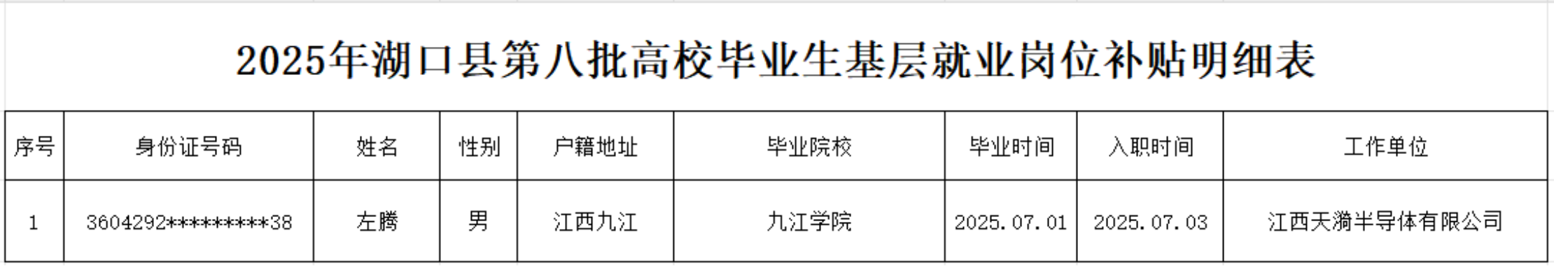 根据《江西省人力资源和社会保障厅 江西省工业和信息化厅 江西省财政厅关于做好高校毕业生基层就业岗位补贴工作的通知》(赣人社〔2025〕108号)文件精神,经本人申请,我中心审核,拟对以下1名2025年入职我县专精特新中小企业就业岗位的高校毕业生(毕业2年内未就业的江西户籍或江西省高校毕业的高校毕业生)落实高校毕业生基层就业岗位补贴,现将人员名单公示如下: