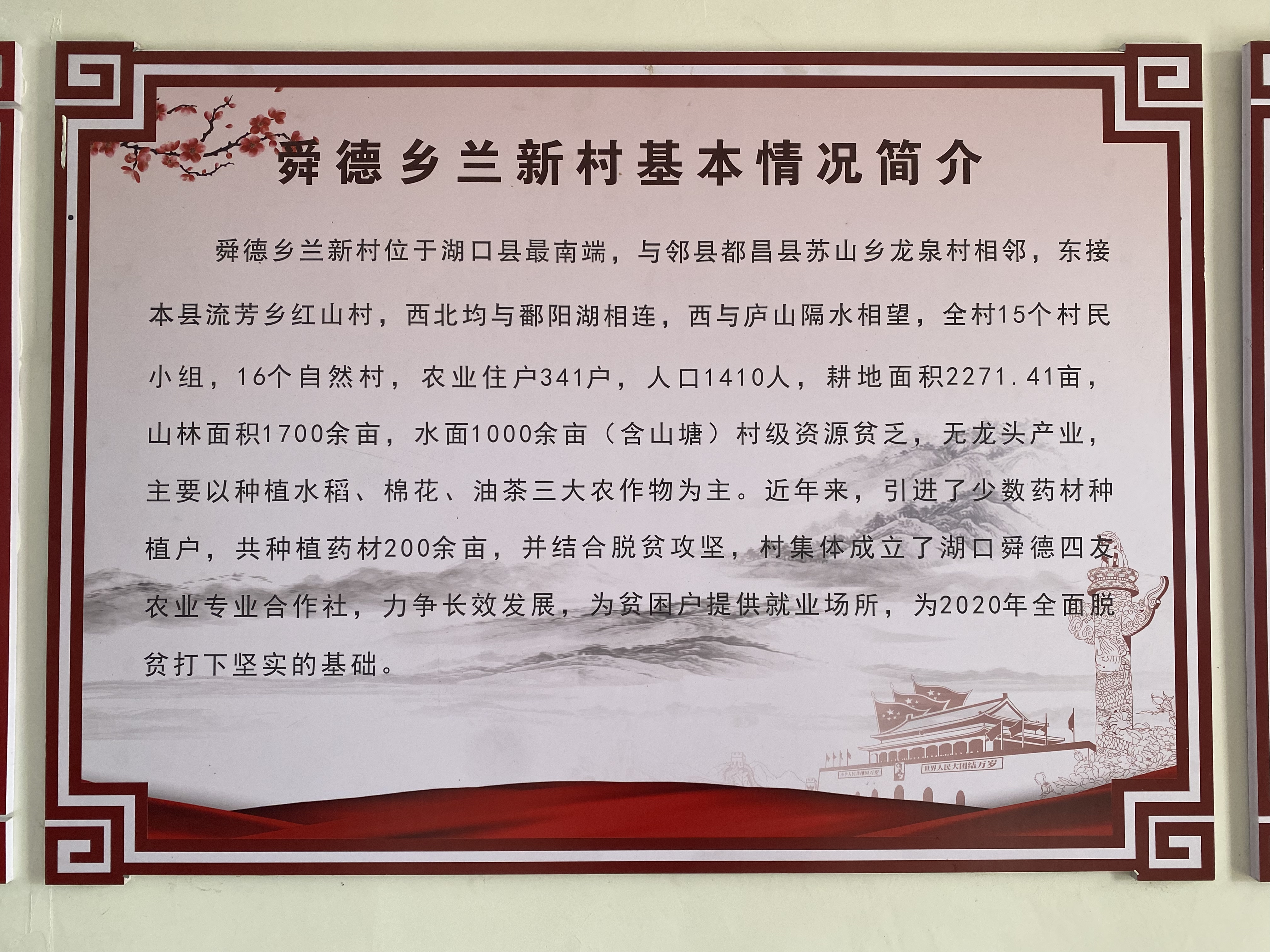 我是舜德乡面积最大、人口最多的行政村,全村总面积38平方公里,其中山地面积13000亩,水域面积24平方公里,耕地面积3385.53亩。山清水秀,环境优美,属鄱湖景区,并有丰富的资源。