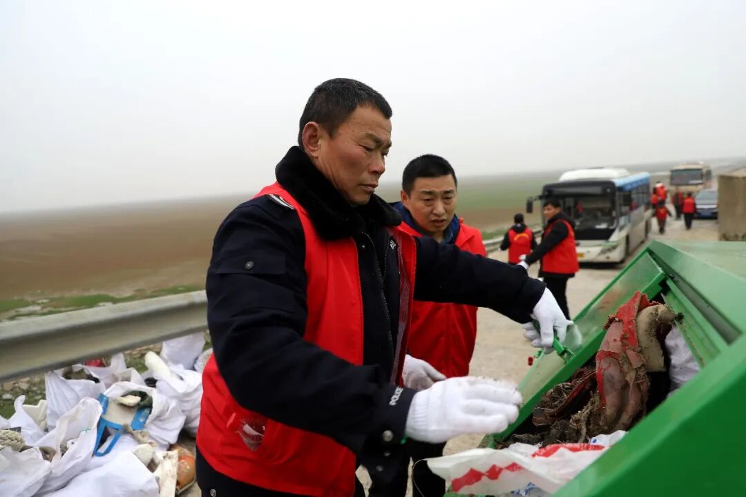 尽管湖边风大微凉,但志愿者们的热情十分高涨。他们手持铁钳、垃圾袋,三五成群地沿着蜿蜒的湖岸线仔细搜寻。大家分工明确,有的用钳子夹起隐藏在草丛中的塑料瓶,有的清理泡沫浮球,还有的走进浅滩湿地,拾取沉积的不可降解垃圾。