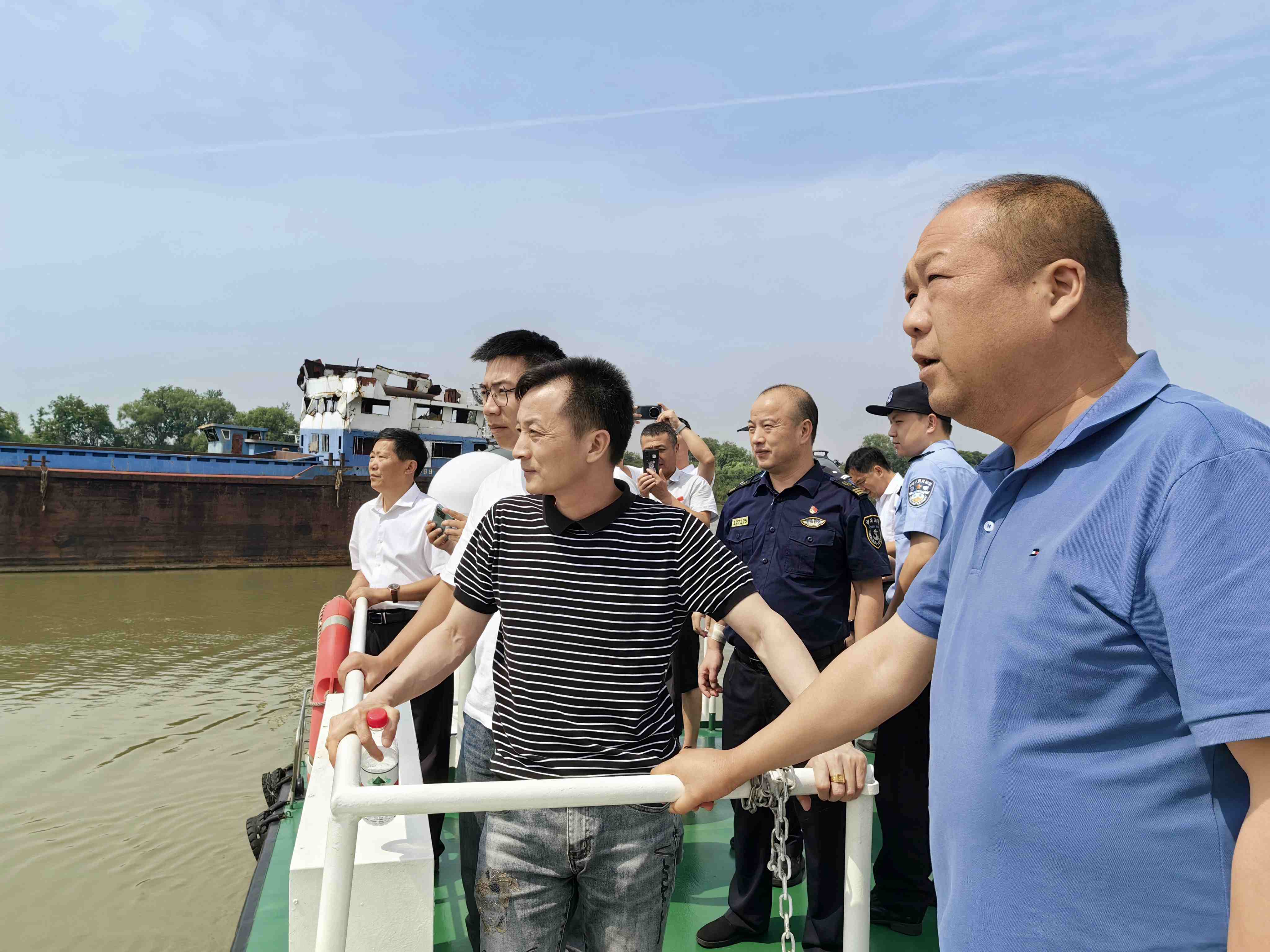 下午两点代表们乘执法艇参观了非法采砂船舶集中停靠点,执法人员介绍了这些平时看似正常的船舶,是如何非法伪装成偷采砂石船舶,随后代表们参观了江西、安徽、湖北三省交界处八里江水域,并介绍了县水利局执法人员在这复杂的水域是如何开展执法行动,抓获非法船舶。