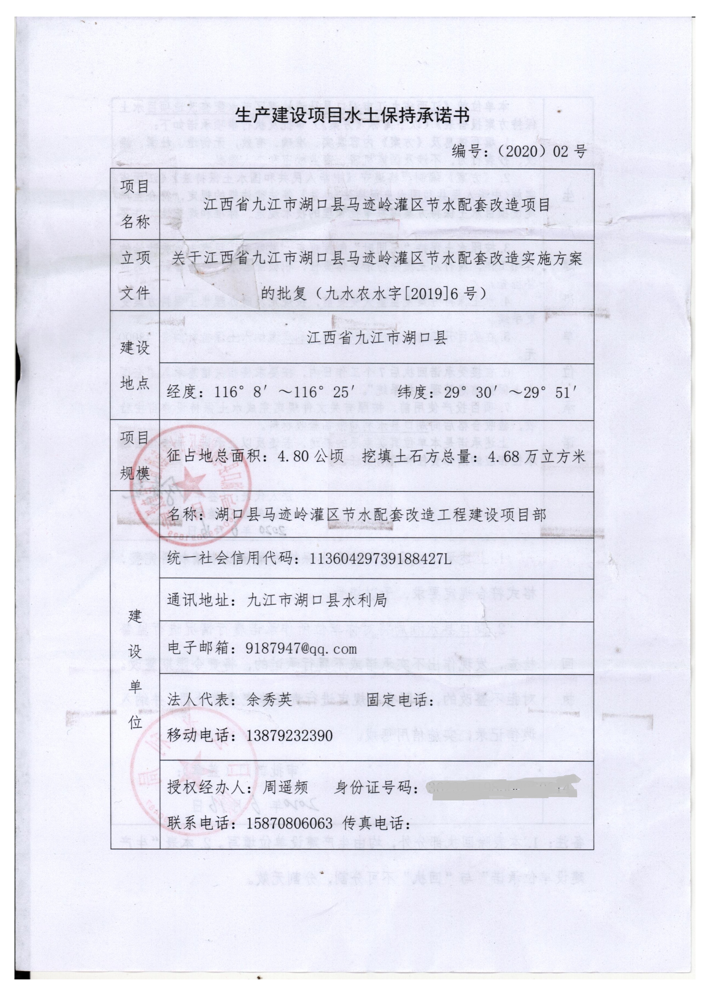 马迹岭灌区节水配套改造项目水土保持承诺书