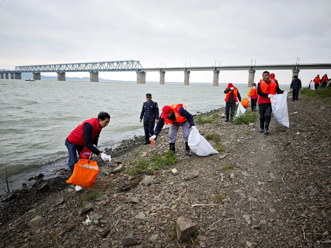 活动中,志愿者们准时集结,统一身着红色马甲,驱车前往鄱阳湖南北港大坝。现场,志愿者们分为三组,手持钳子、垃圾袋等工具,沿湖岸认真清理被湖水冲刷到岸边的塑料瓶、塑料袋与纸壳等白色垃圾。经过数小时的努力,湖岸环境得到明显改善。