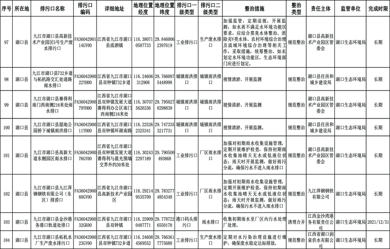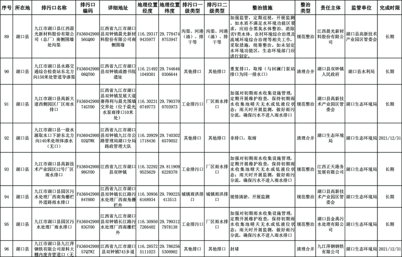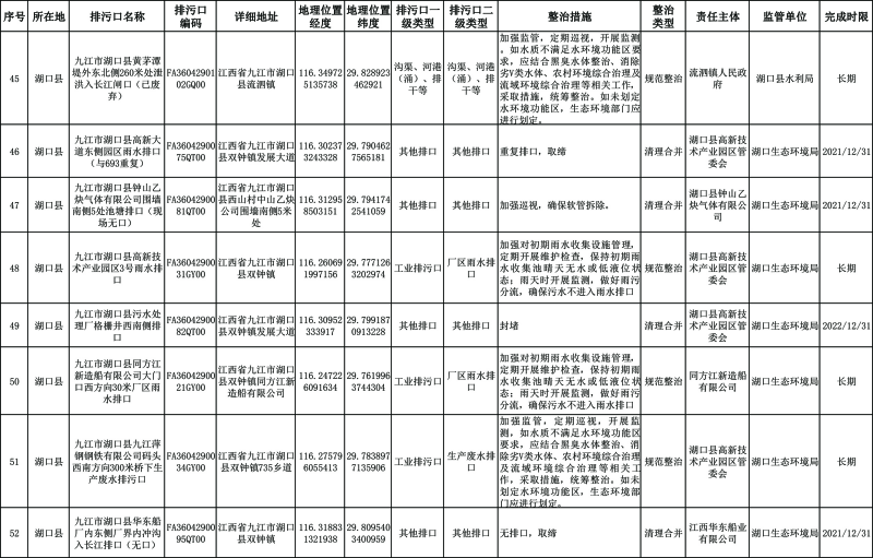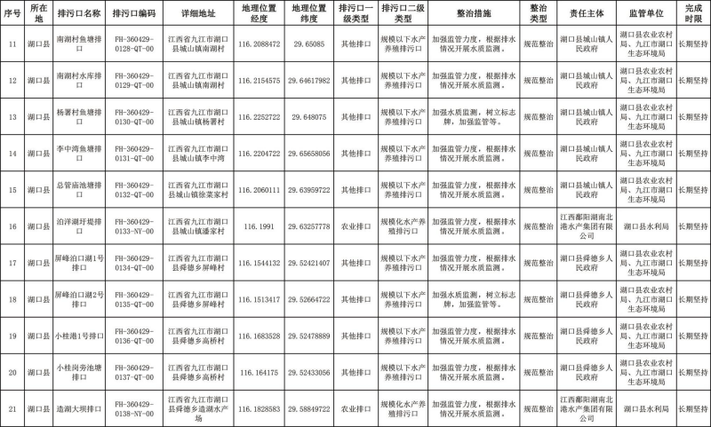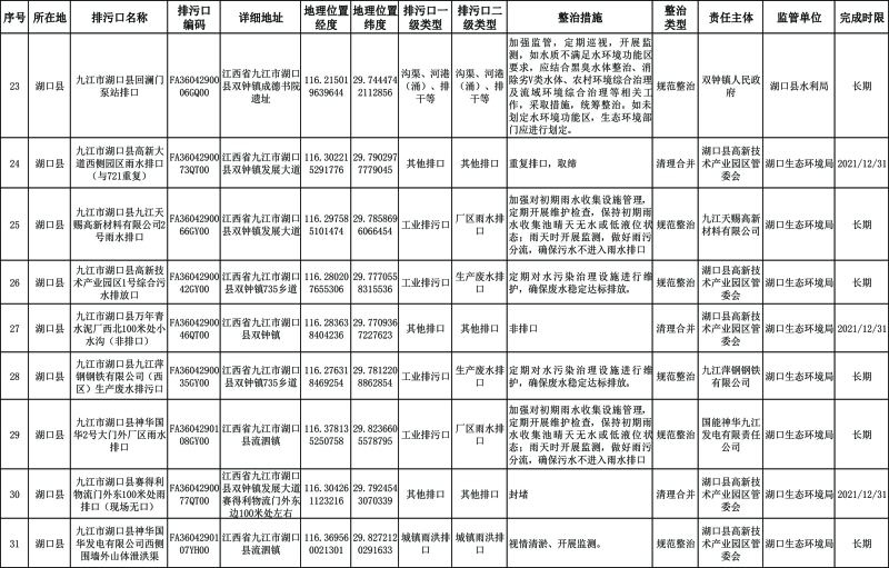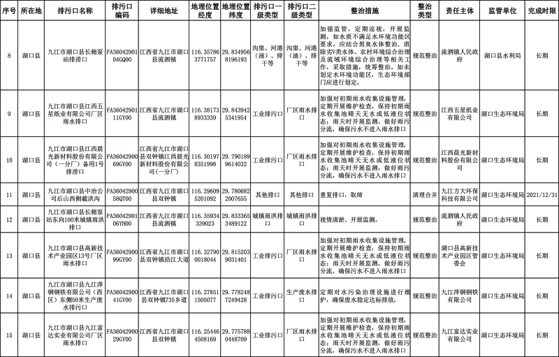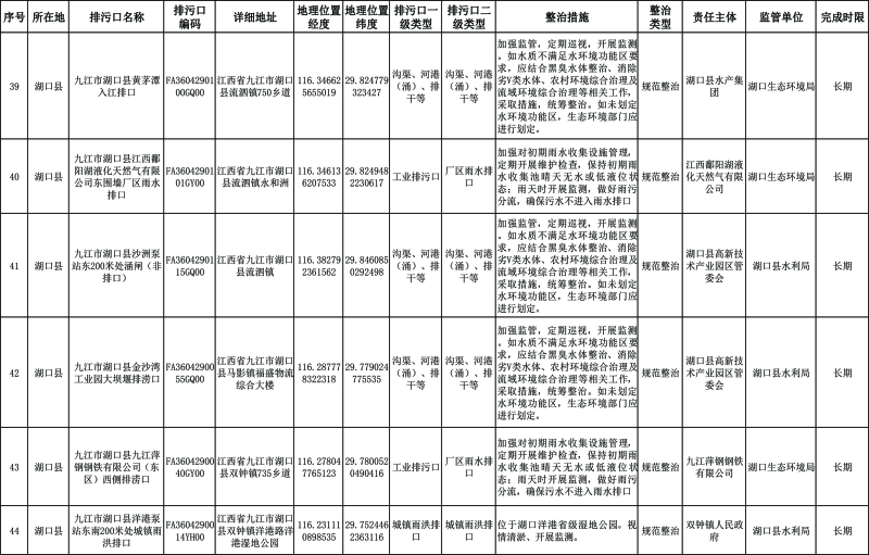 长江干流湖口段:2023年年底前,完成70%左右的排污口整治工作,截污治污取得阶段性成效。2025年年底前基本完成排污口整治工作:城市建成区基本消除生活污水直排口和收集处理设施空白区,切实解决污水违规溢流直排问题。
