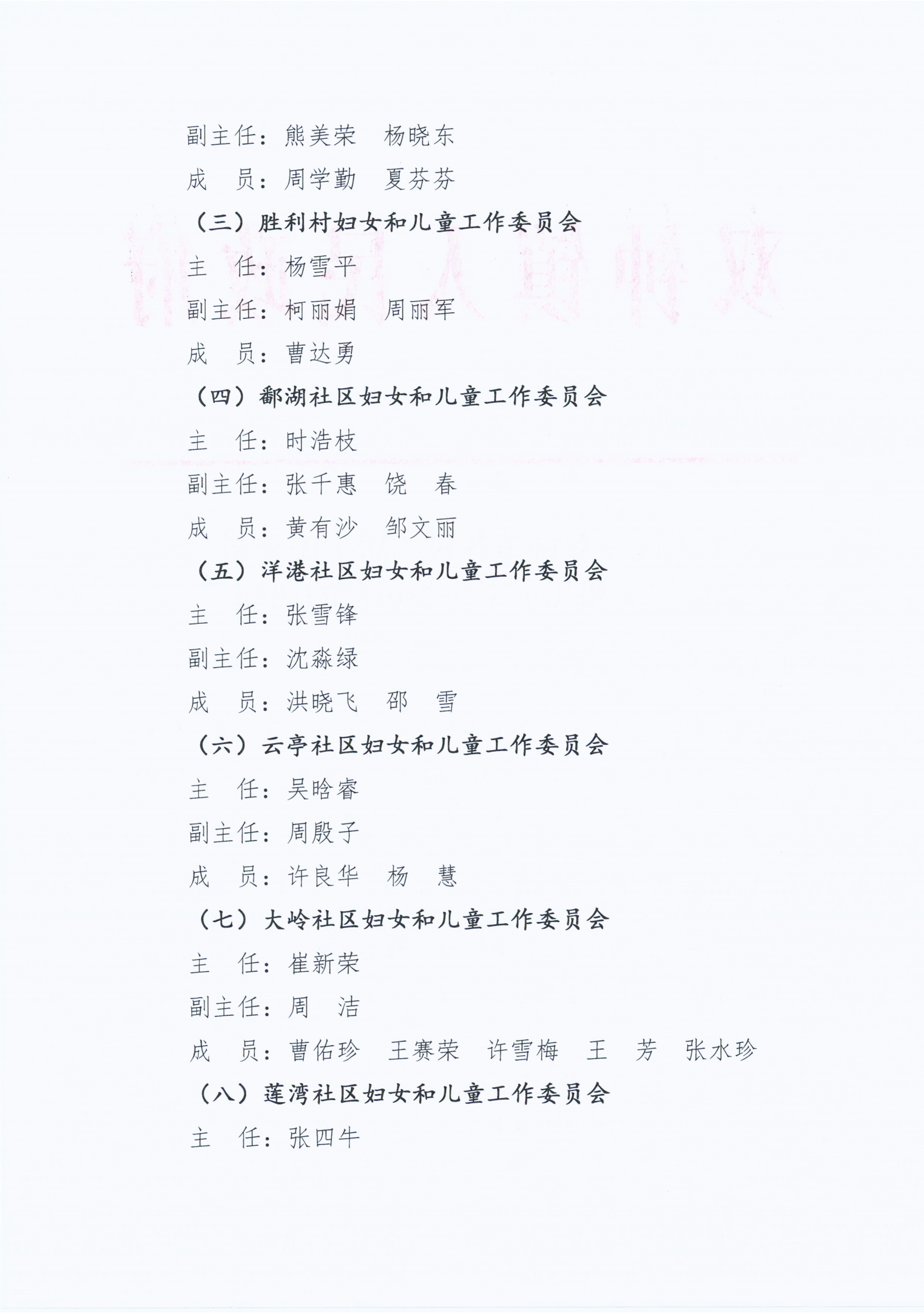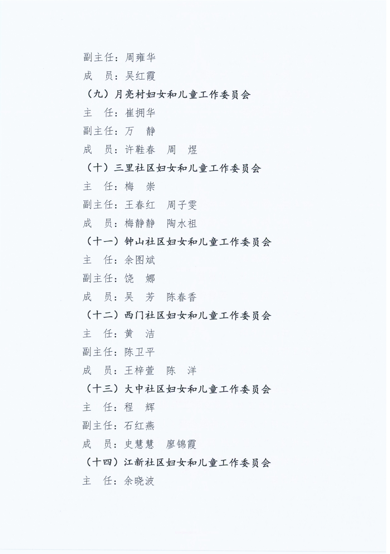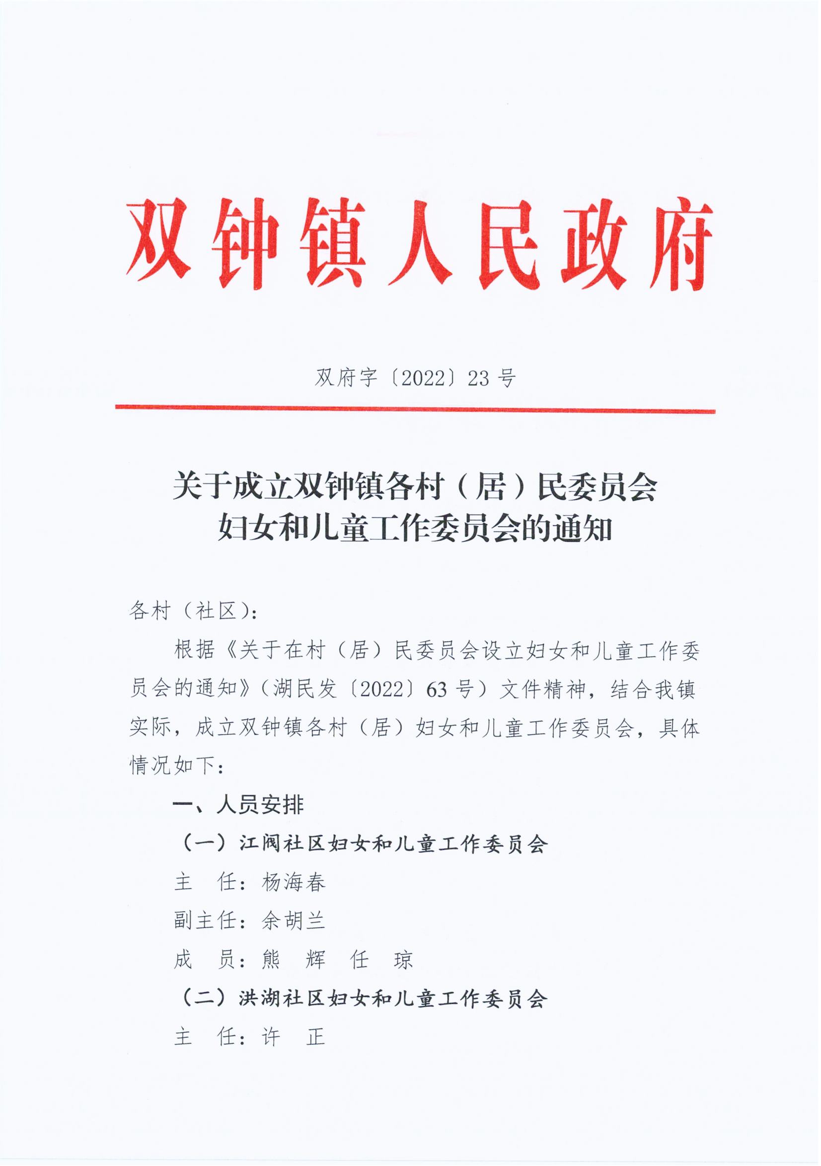 关于成立双钟镇各村(居)民委员会妇女和儿童工作委员会的通知