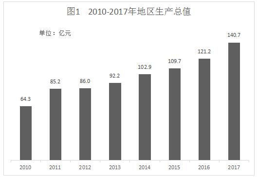 初步核算,全年地区生产总值(GDP)140.73亿元,按可比价格计算,比上年增长9.0%。其中第一产业增加值14.41亿元,增长4.5%,第二产业增加值96.98亿元,增长8.8%,第三产业增加值29.33亿元,增长12%。三次产业结构比为10.2:68.9:20.9,第三产业占GDP的比重较上年提升了1个百分点。人均GDP49691元,增长9.5%。非公有制经济稳步发展,实现增加值102.48亿元,增长9.4%,占GDP比重为72.8%。