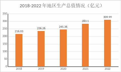 初步核算,全年地区生产总值(GDP)309.99亿元,按可比价格计算,比上年增长5.6%。其中第一产业增加值17.74亿元,增长4.4%,第二产业增加值211.58亿元,增长6.0%,第三产业增加值80.68亿元,增长4.8%。三次产业结构比为5.7:68.2:26.1。初步测算人均GDP达14万元。非公有制经济稳步发展,实现增加值234.83亿元,增长6.6%,占GDP比重为75.8%。